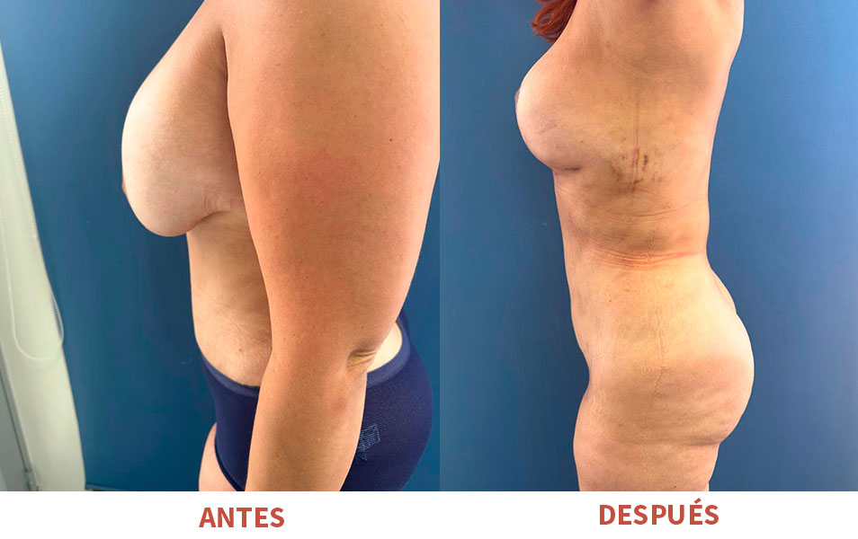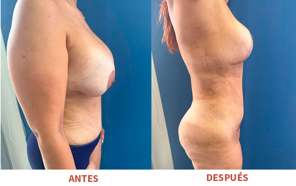 Redefinición del contorno corporal con liposucción. Vista lateral derecha: resultados visibles, proporciones equilibradas.
